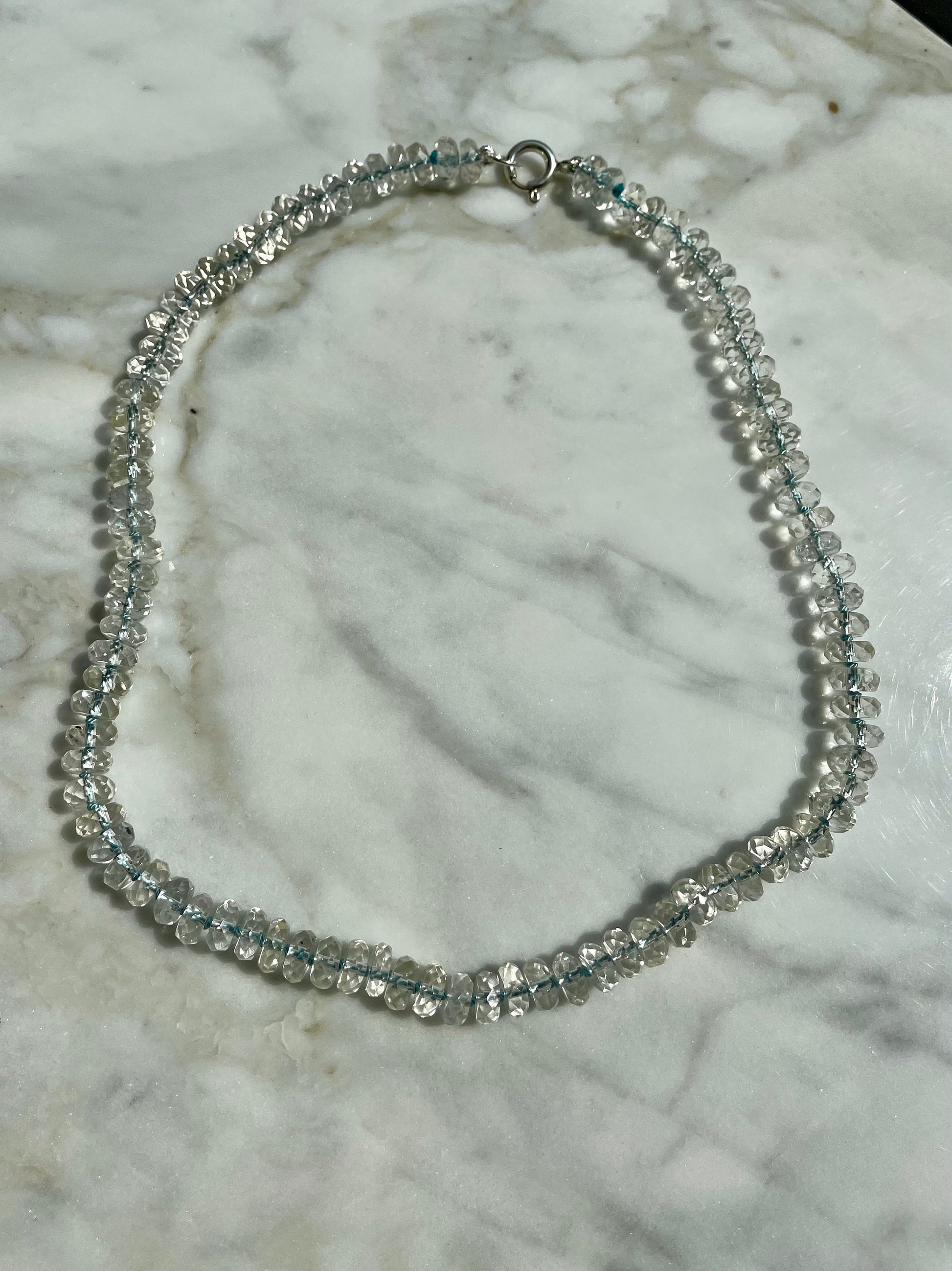 Exquisitely cut Quartz hand knotted on blue silk thread, and finished with 925 stamped sterling silver. Featured here at 18”. Please inquire for a variety of thread color options.