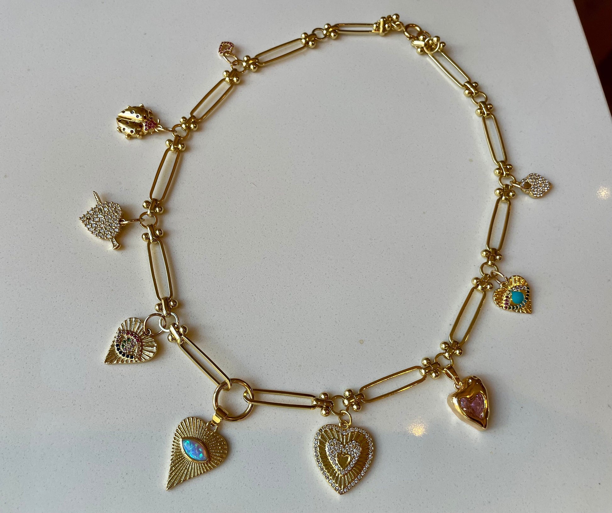 18K Gold Filled large pattern Paperclip chain with assorted gold filled heart charms, 18”.