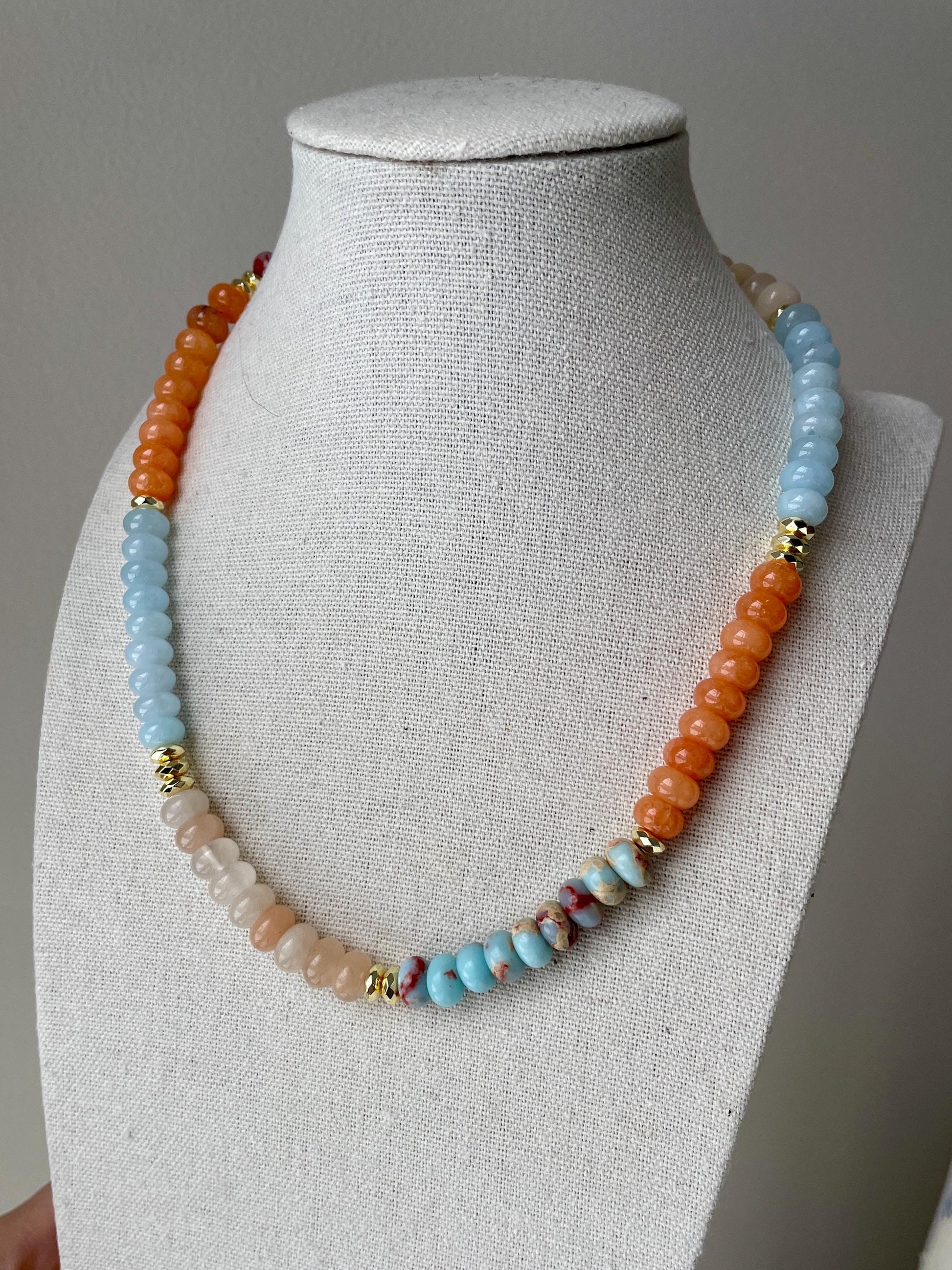 Beach Day is a color blocked gemstone beaded necklace strung on beading wire and finished with 14K gold filled clasp. 17” with 2” extender.
