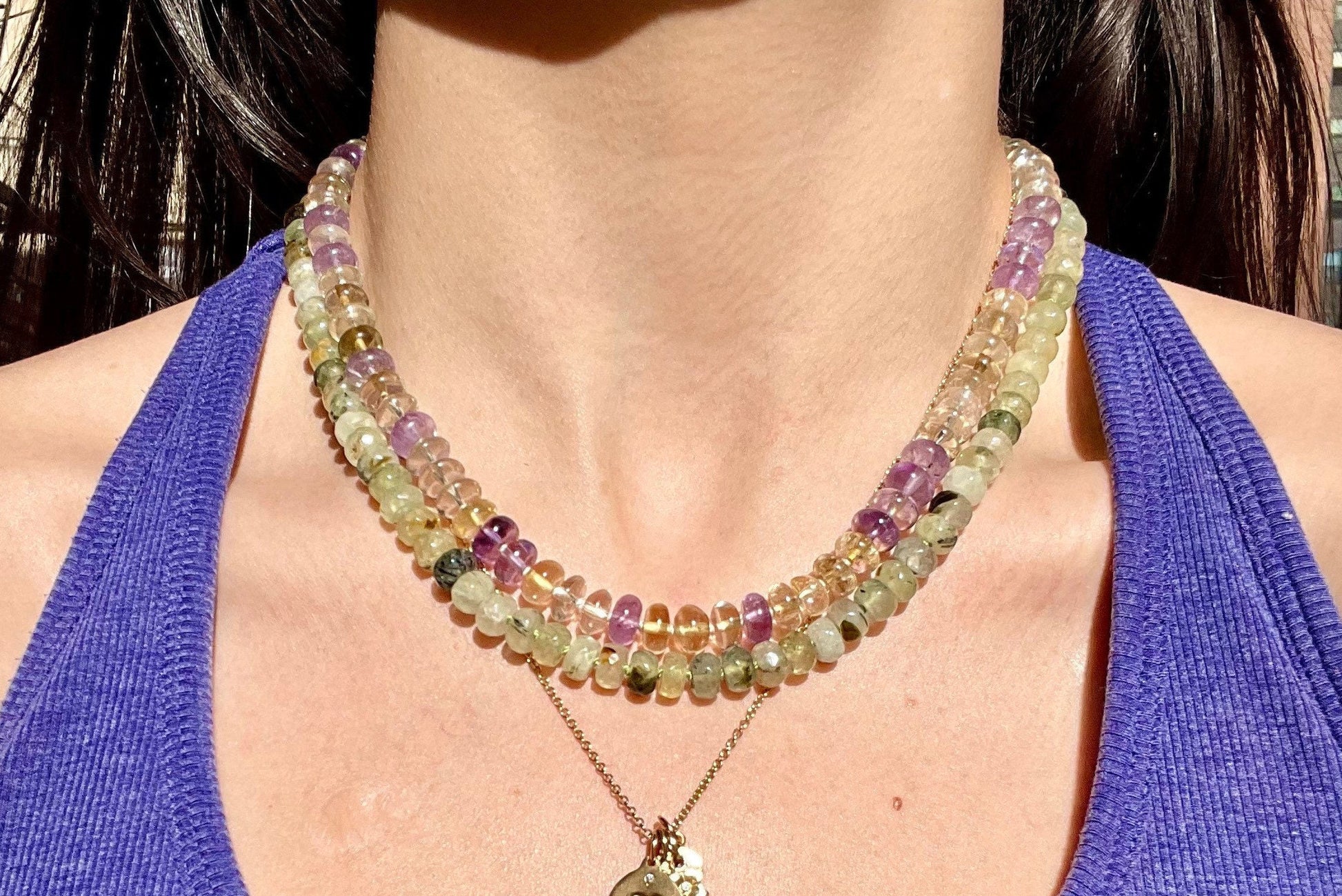 This unique natural prehnite gemstone candy necklace is hand knotted on silk thread with 925 stamped sterling silver findings. The listing photos feature the 18" version.