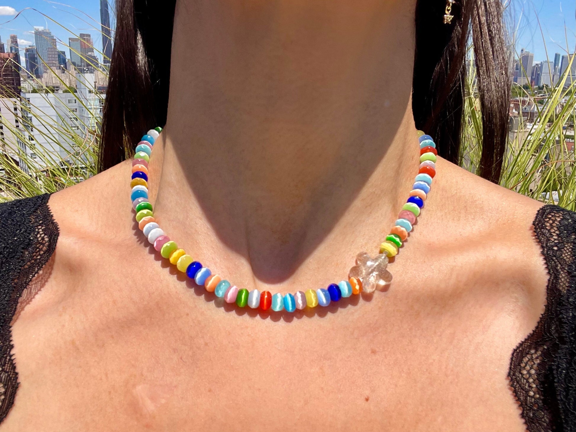 A Cat’s Eye Rainbow mosaic choker with jumbo quartz center star, on silk thread and finished with 14k gold filled findings.