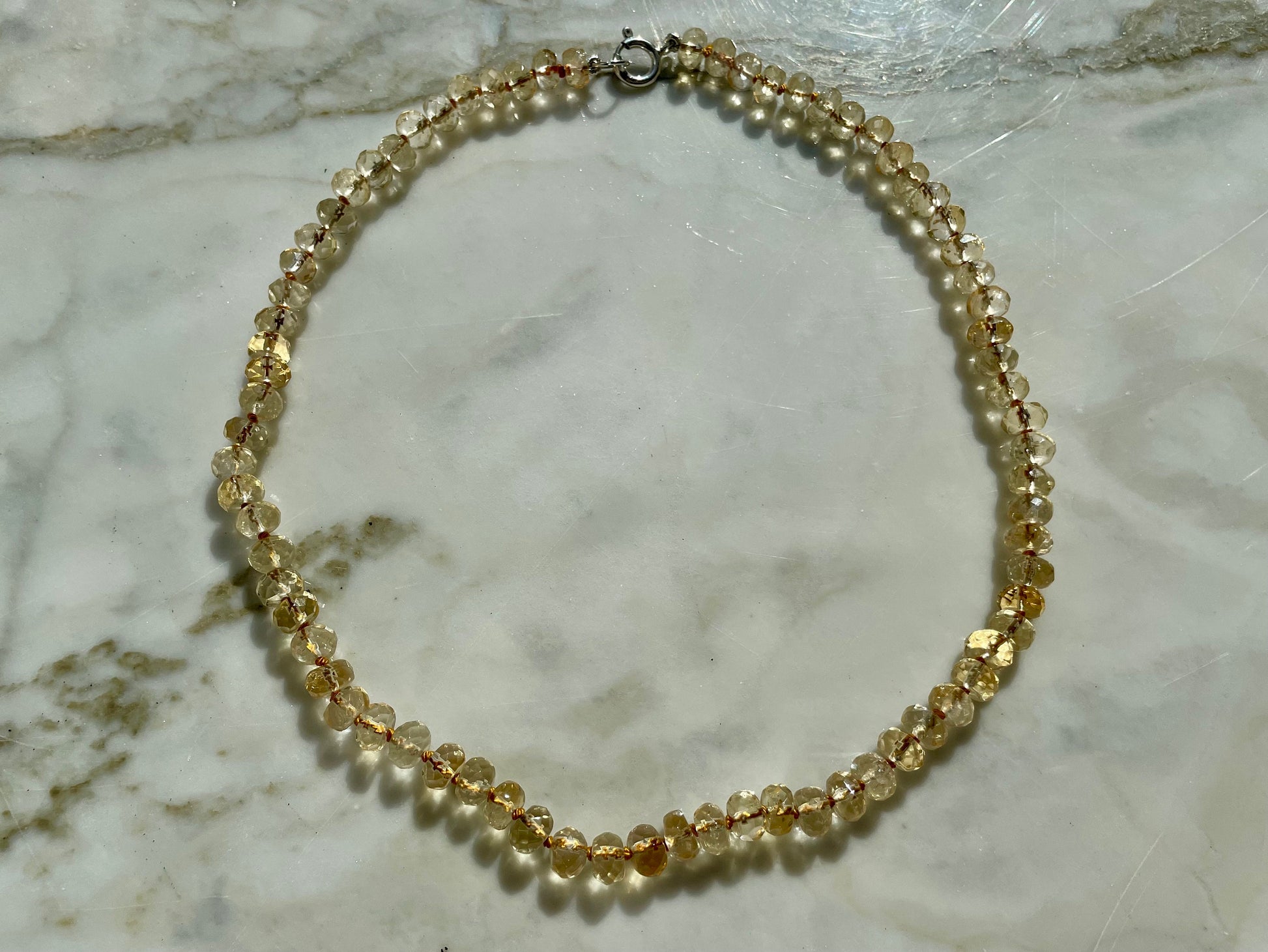 The Crystal Light Gemstone Candy Necklace features peachy citrine hand-knotted on silk thread and finished with 925 stamped sterling silver. The listing photo features the 17” version. Please inquire for additional lengths and metal finishes.