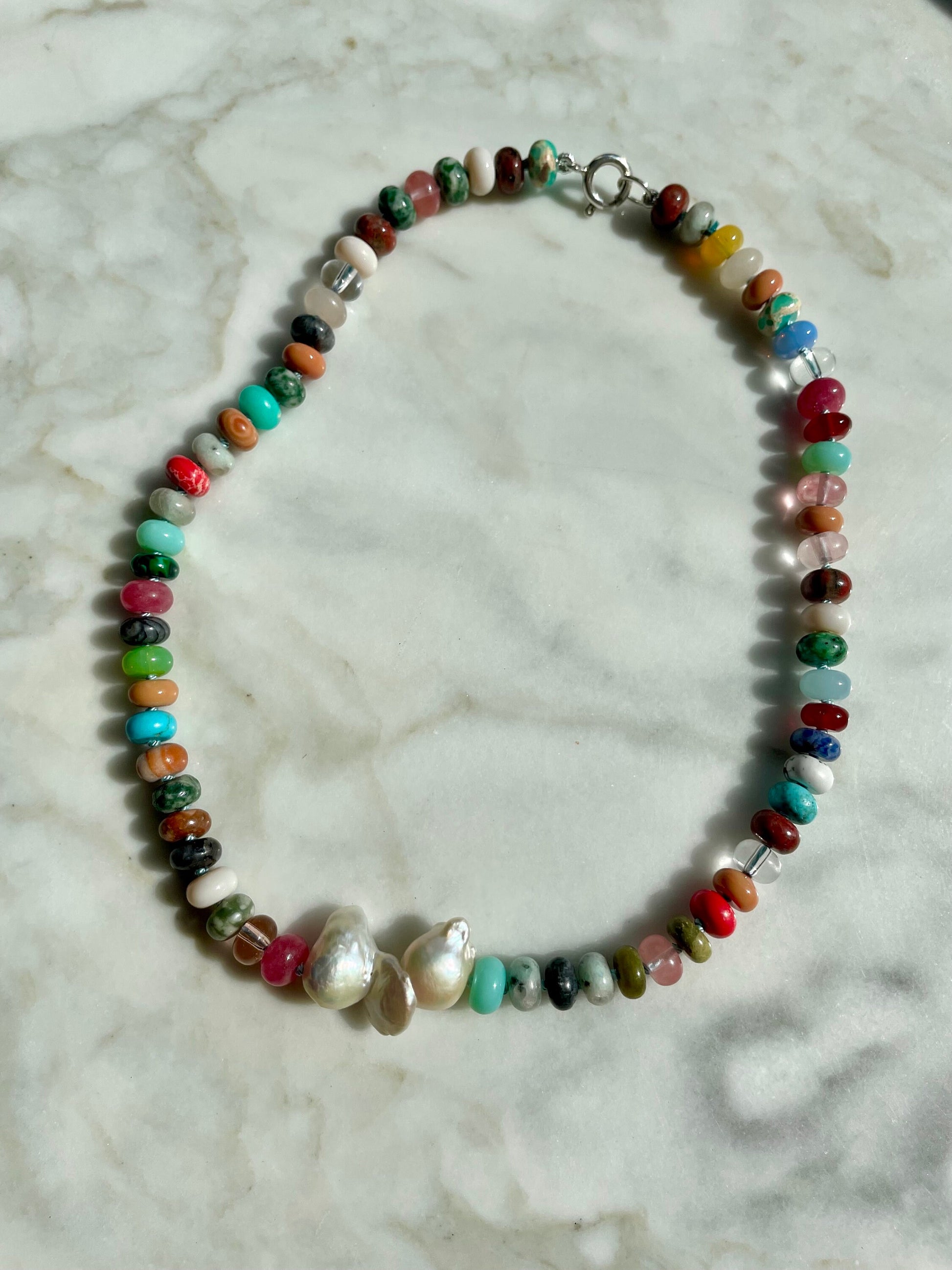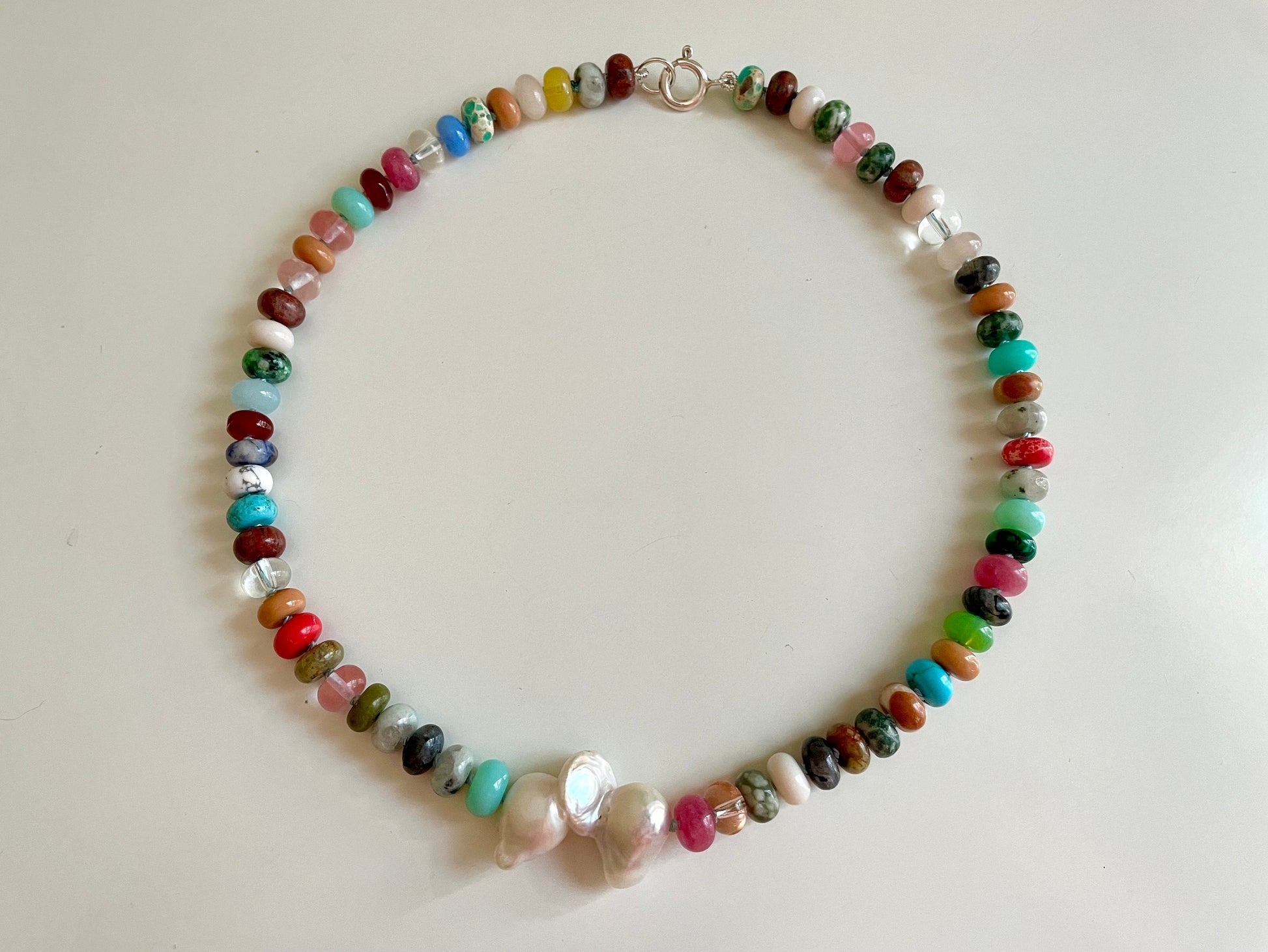Every Flavor Beans is the jelly bean inspired gemstone necklace of my dreams. Featuring a truly one of a kind jumbo freshwater Pearl, all hand knotted on baby blue silk thread, and finished with 925 stamped sterling silver findings. Listing photos are of the 17” version. Please inquire for different thread colors and metal finishes.