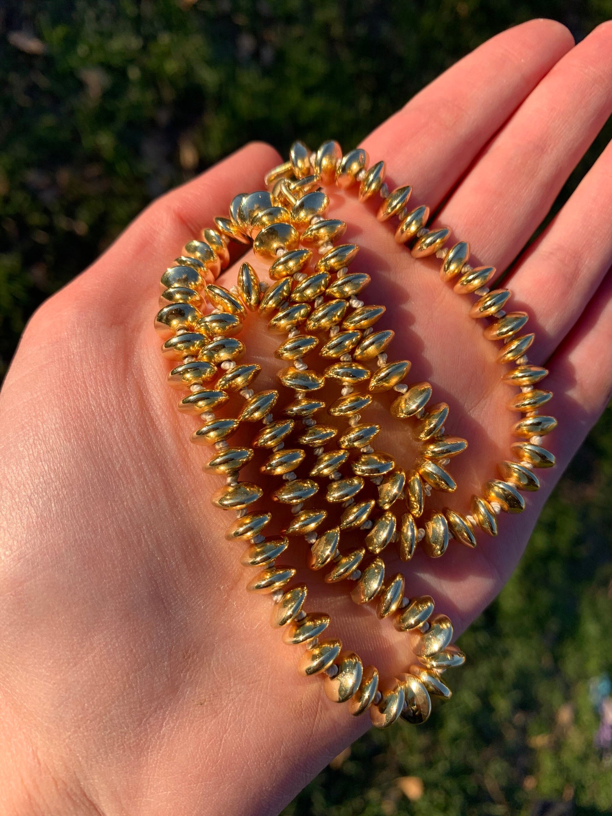 The 'Ferrero Rocher' Candy Necklace is from my original nostalgia line with a nod to modern chunky chains. An ode to the candy necklace of your childhood with a luxe feel. My pieces are designer inspired and priced for accessibility. This necklace features gold hematite rondelle stones, hand knotted on golden silk thread. The cover photo features 'The Golden Ticket' in 18". My pieces are most often made to order, if you don’t see your favorite color or length please reach out!