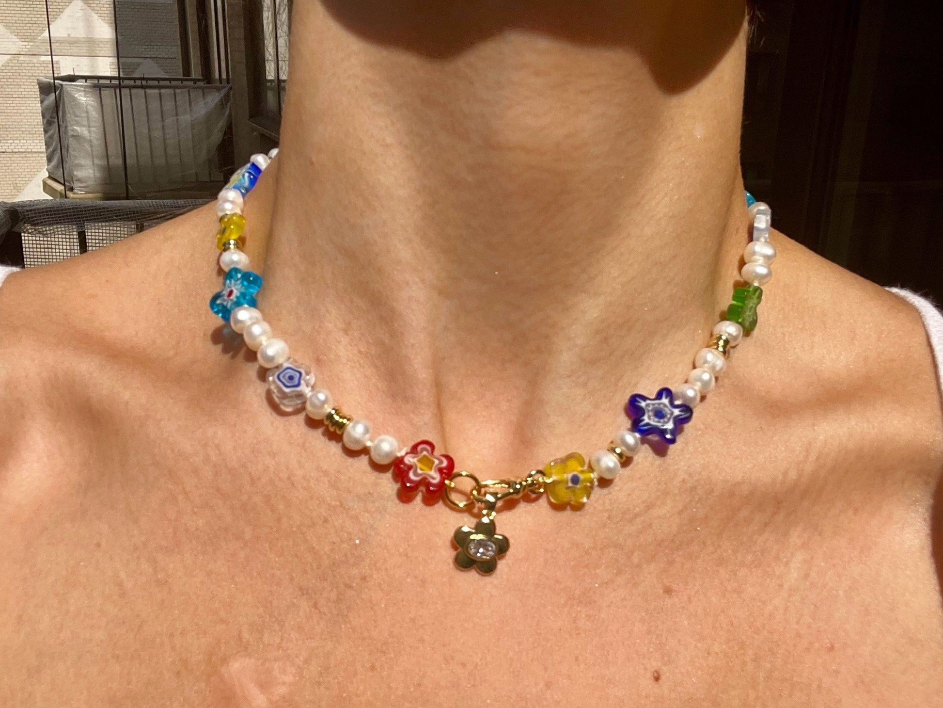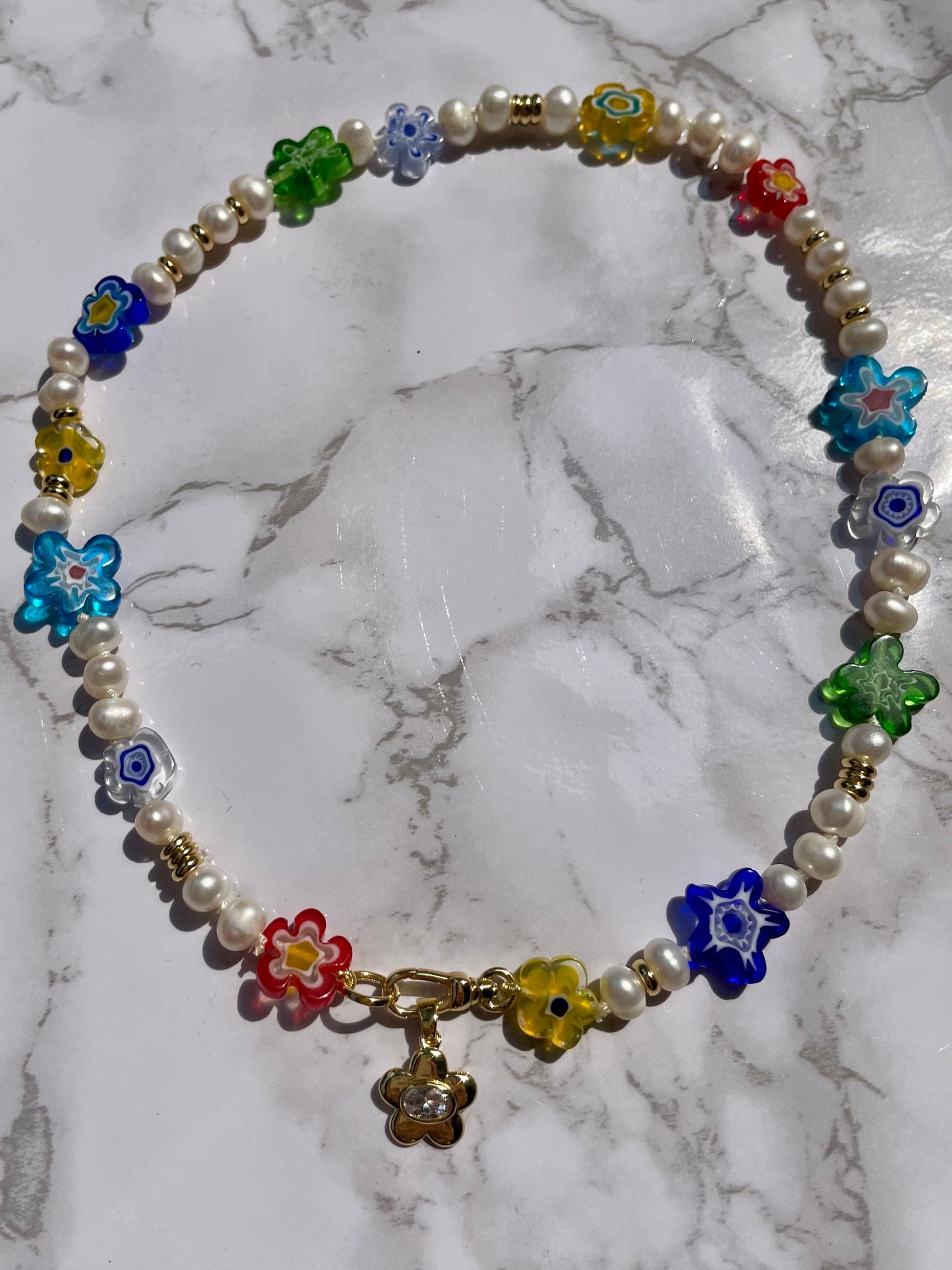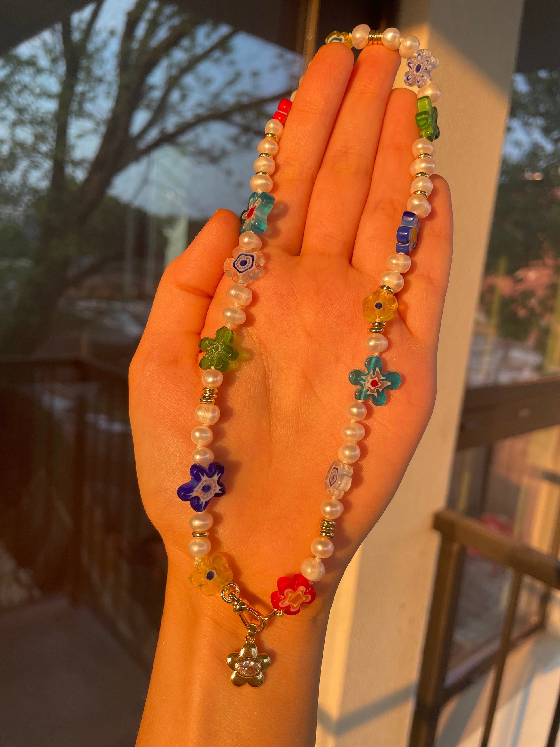 Freshwater pearls and rainbow millefiori glass flowers hand knotted on silk thread, featuring a 14k gold filled enhancer clasp and crystal heart charm.
