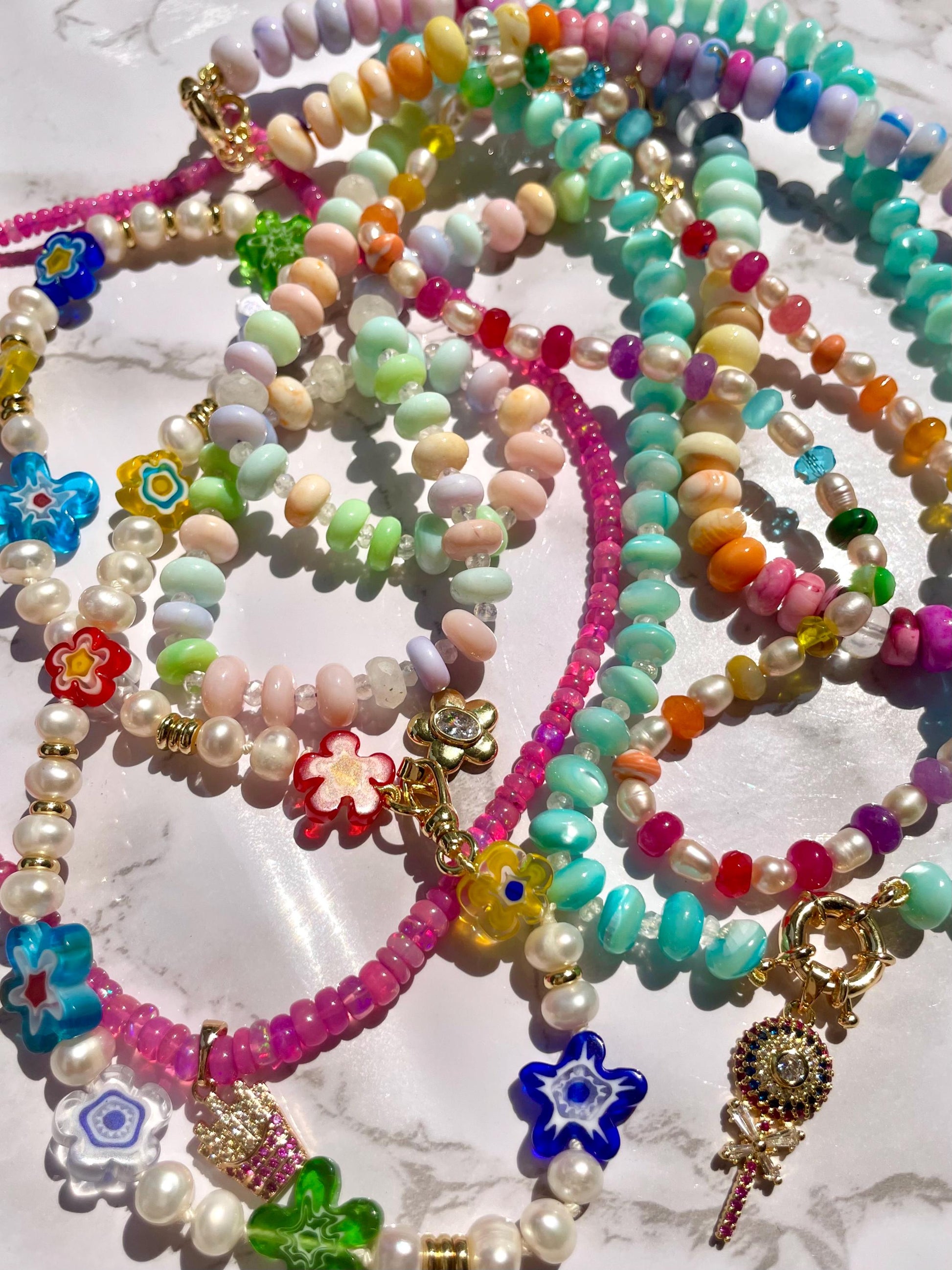 Hot pink graduated opals finished with 14k gold filled findings and pink french fry charm. Happy to remove the charm, I just love it!
