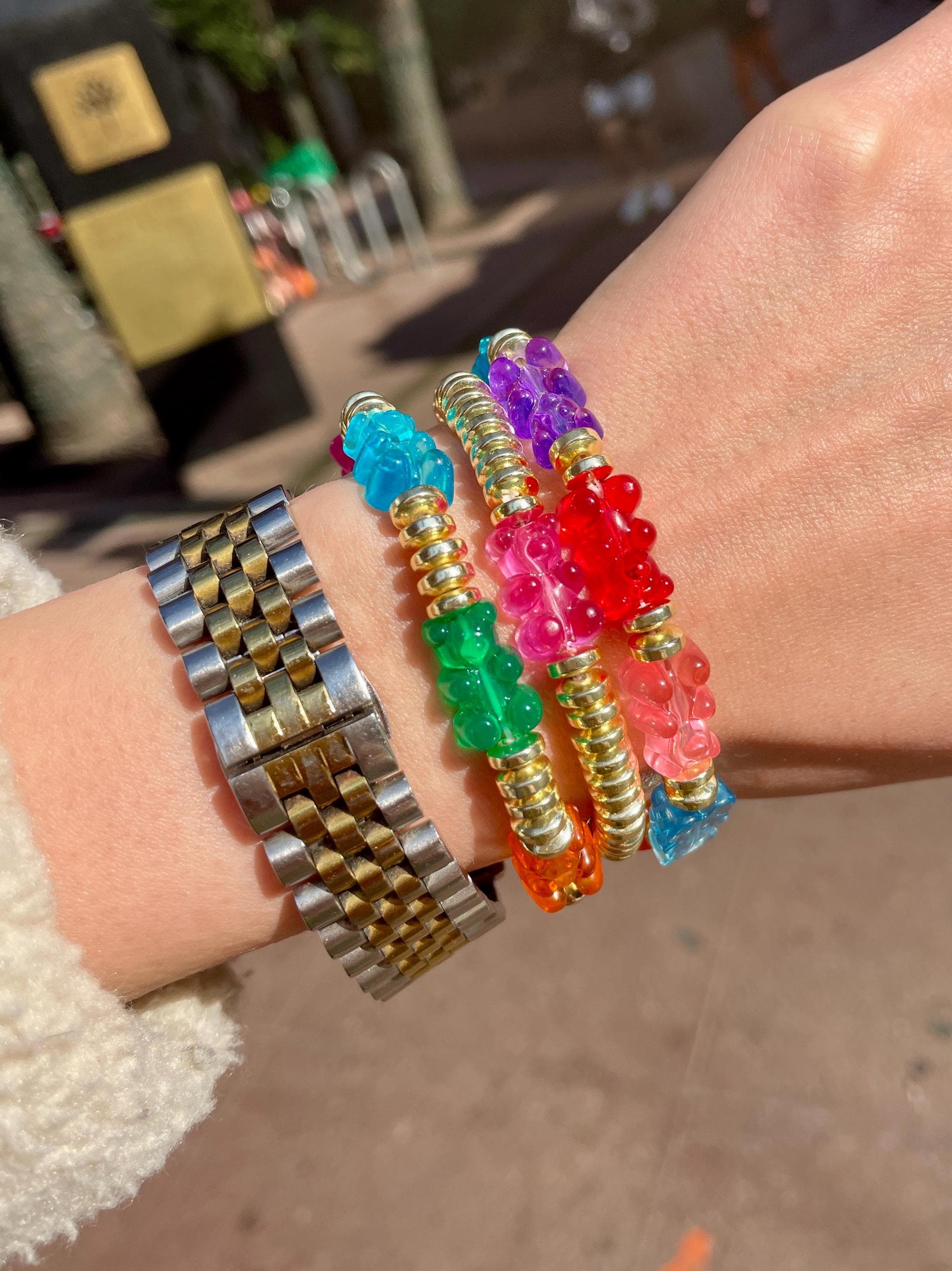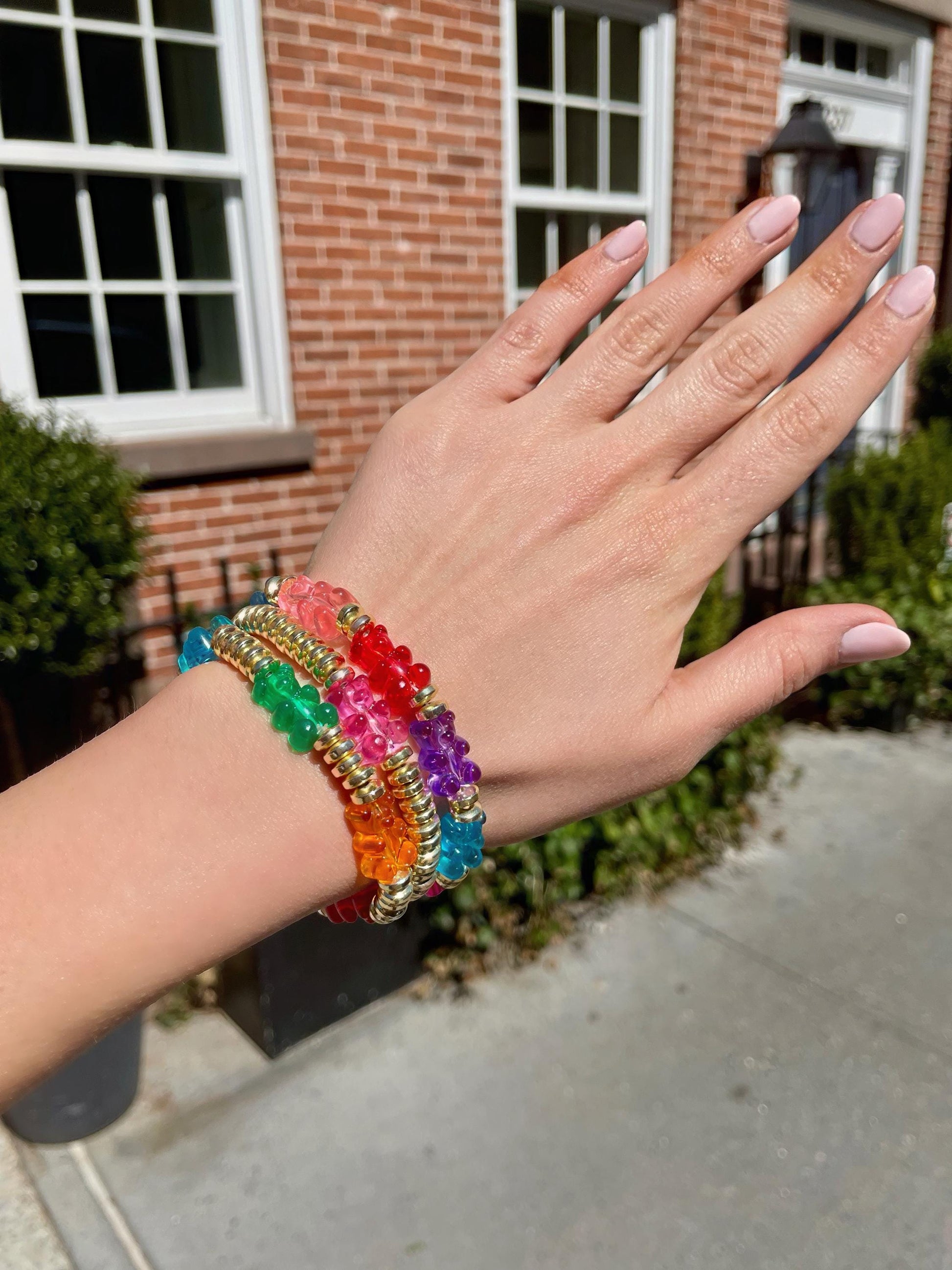 Goldie Bears rainbow gummy bear and 14K gold filled disc beaded stacking set. Wear 1,2, or 3 little bears. Perfect for layering and dressing up vaca looks.