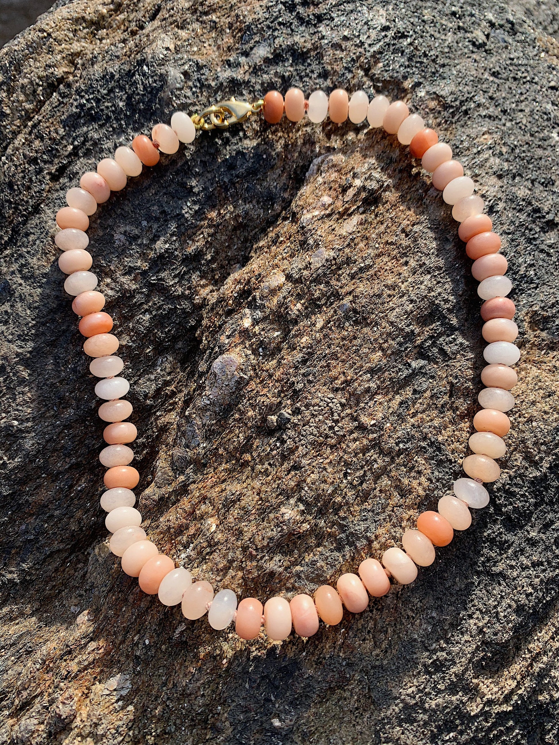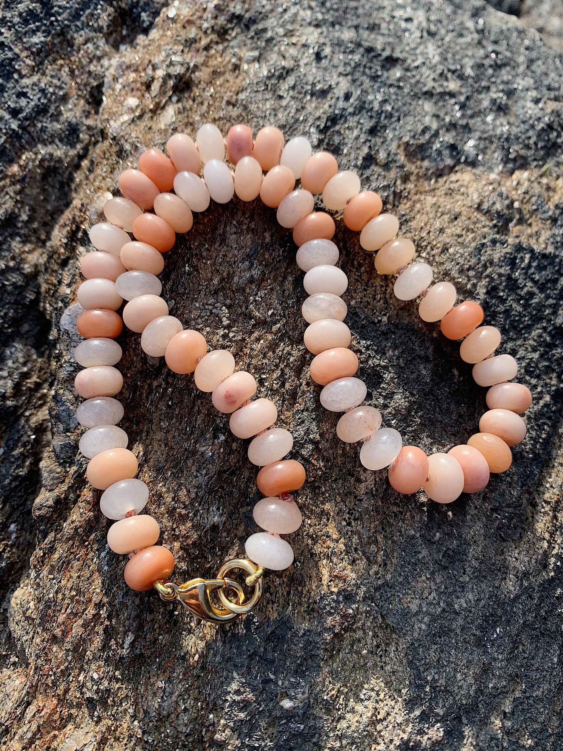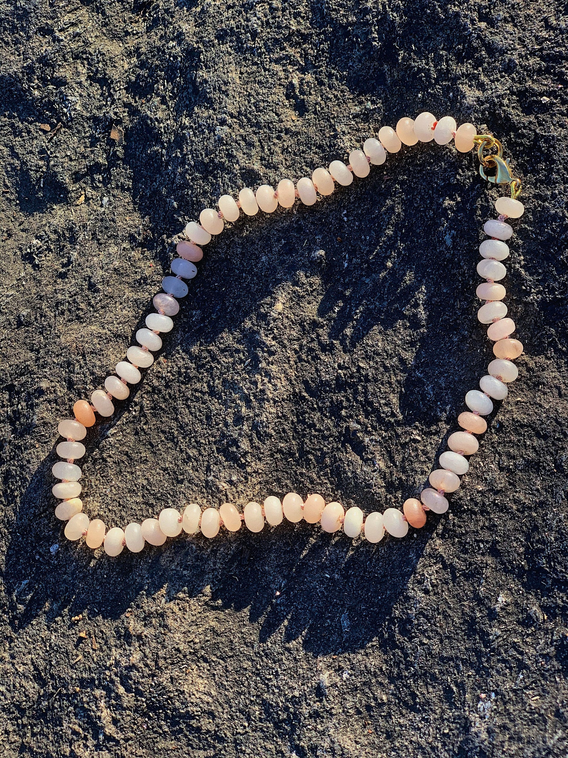 The 'James and the Giant Peach' Candy Necklace is from my latest nostalgia line. An ode to the candy necklace of your childhood with a luxe feel. This 16" necklace features varying shades of pink aventurine rondelle stones, hand knotted on baby pink silk thread.