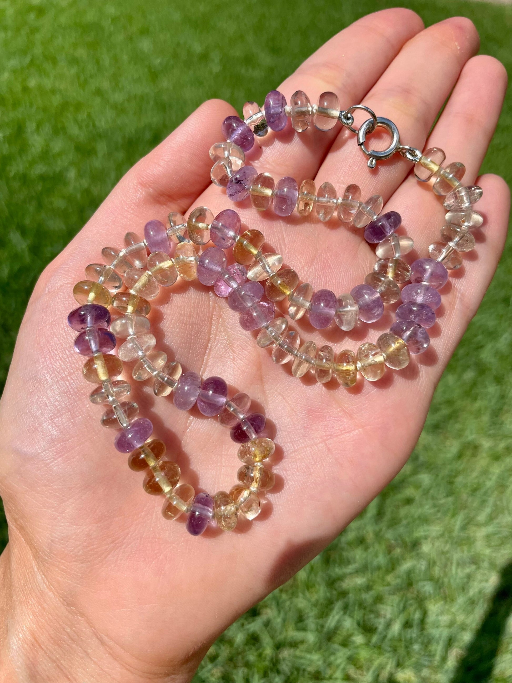 17” Citrine, Quartz, and Amethyst gemstone candy necklace hand knotted on silk thread with 925 stamped sterling silver findings.