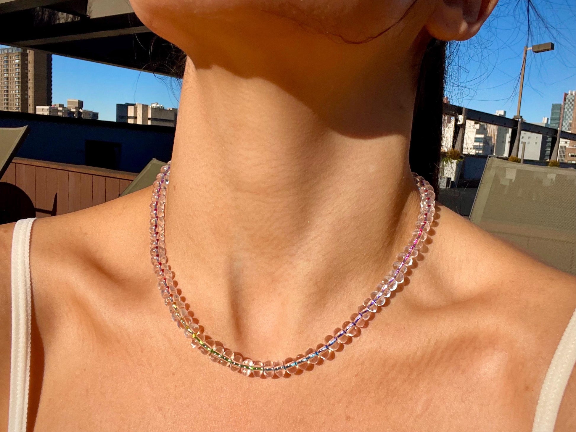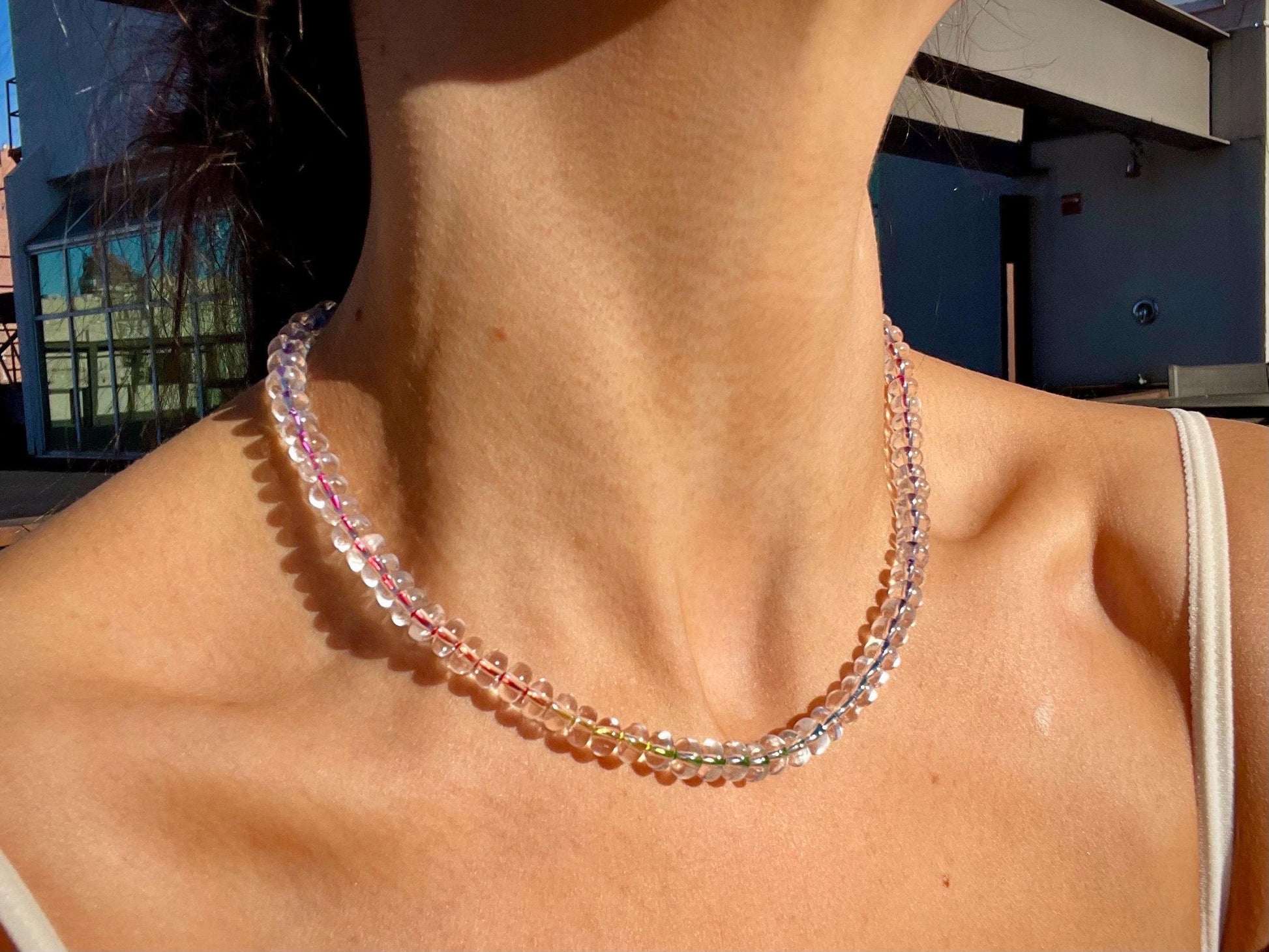 Lil smooth quartz stones hand knotted on rainbow silk thread and finished with 14K gold filled enhancer charm clasp.