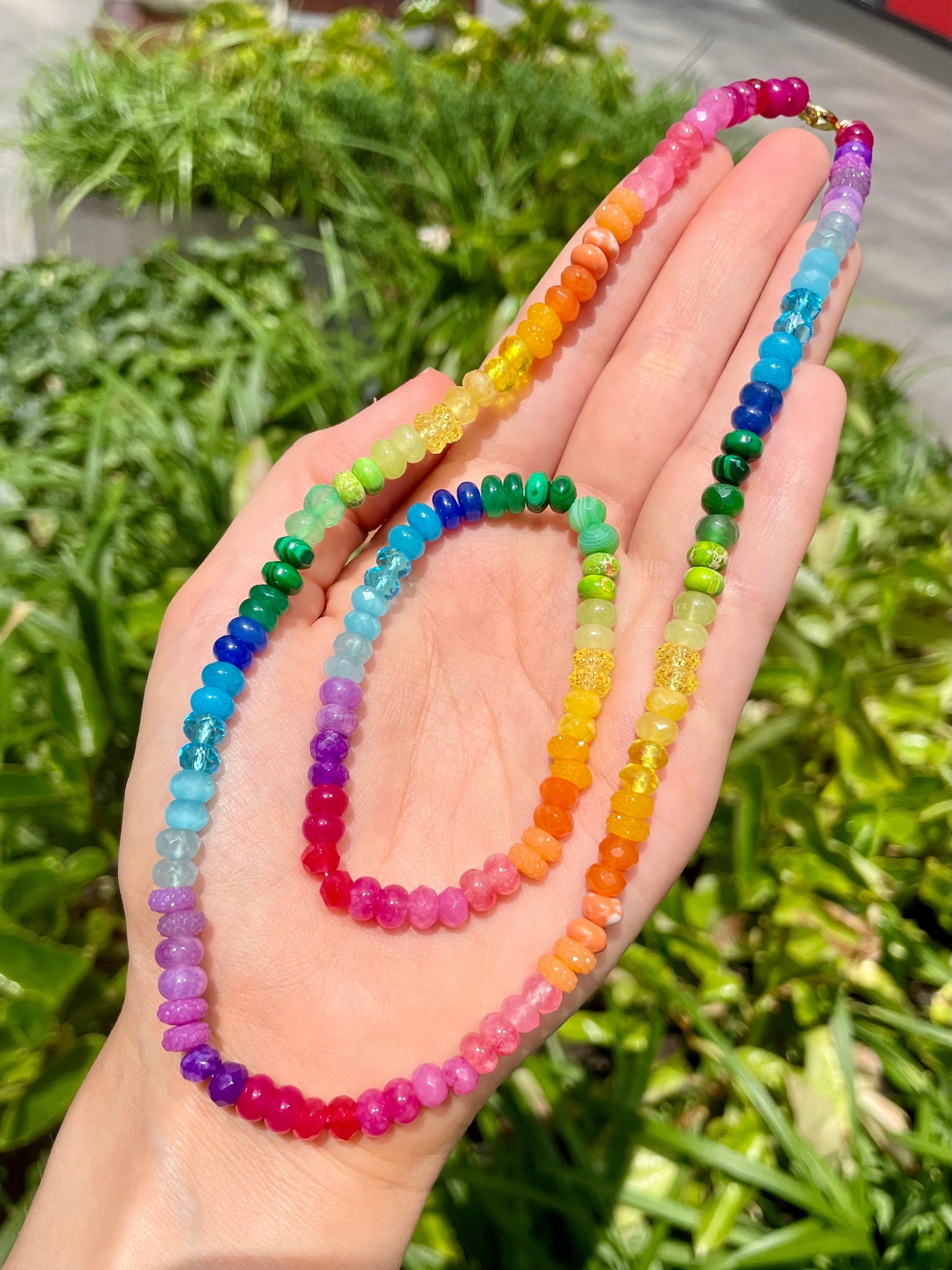 Lil Skittlita’s matching stretchy bracelet features and beautiful gemstone rainbow to stack or wear alone.