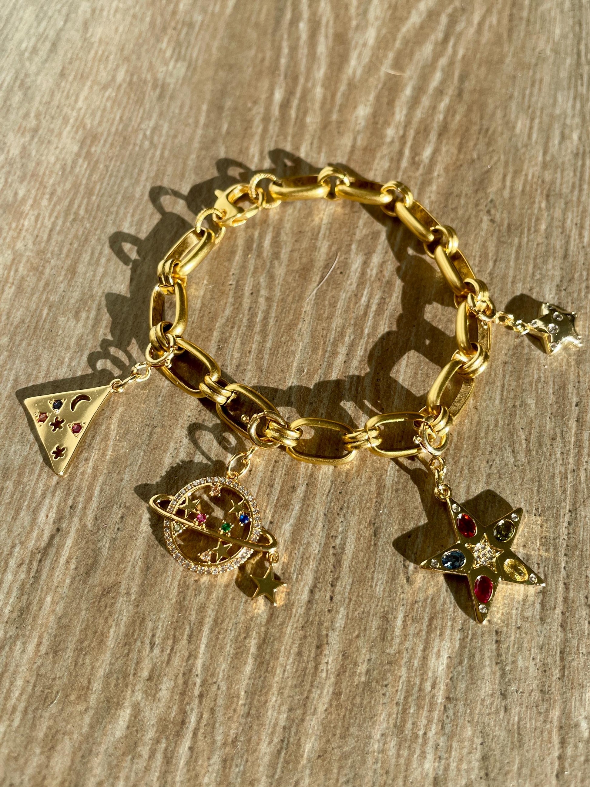 7” antique brass rectangular chain with 4 removable galactic charms. Remove them and add to your other favorite charmable pieces.