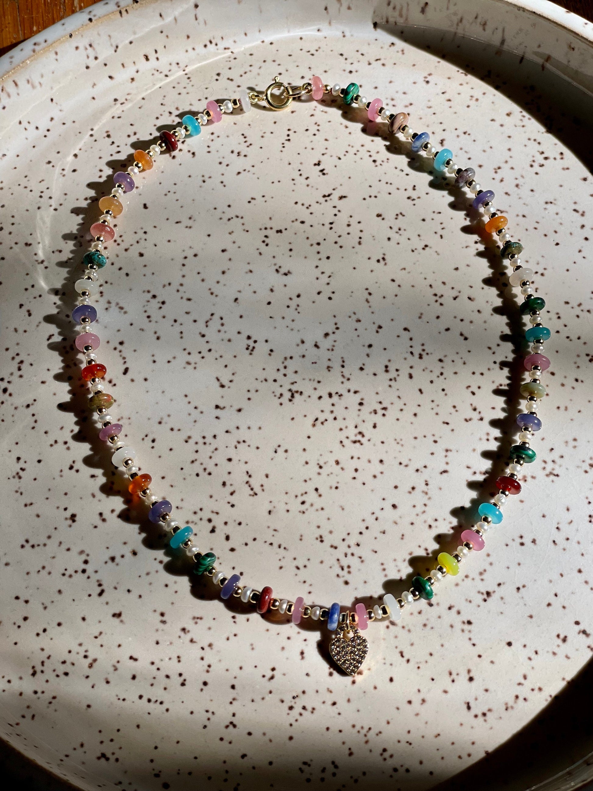 The Little Love Necklace is the perfect piece for layering or worn alone. It features baby gemstone, pearl, and a crystal 14K gold filled heart charm all strung on durable wire and finished with gold filled findings. The listing photos feature the 16” version. Please inquire for additional lengths and metal finishes