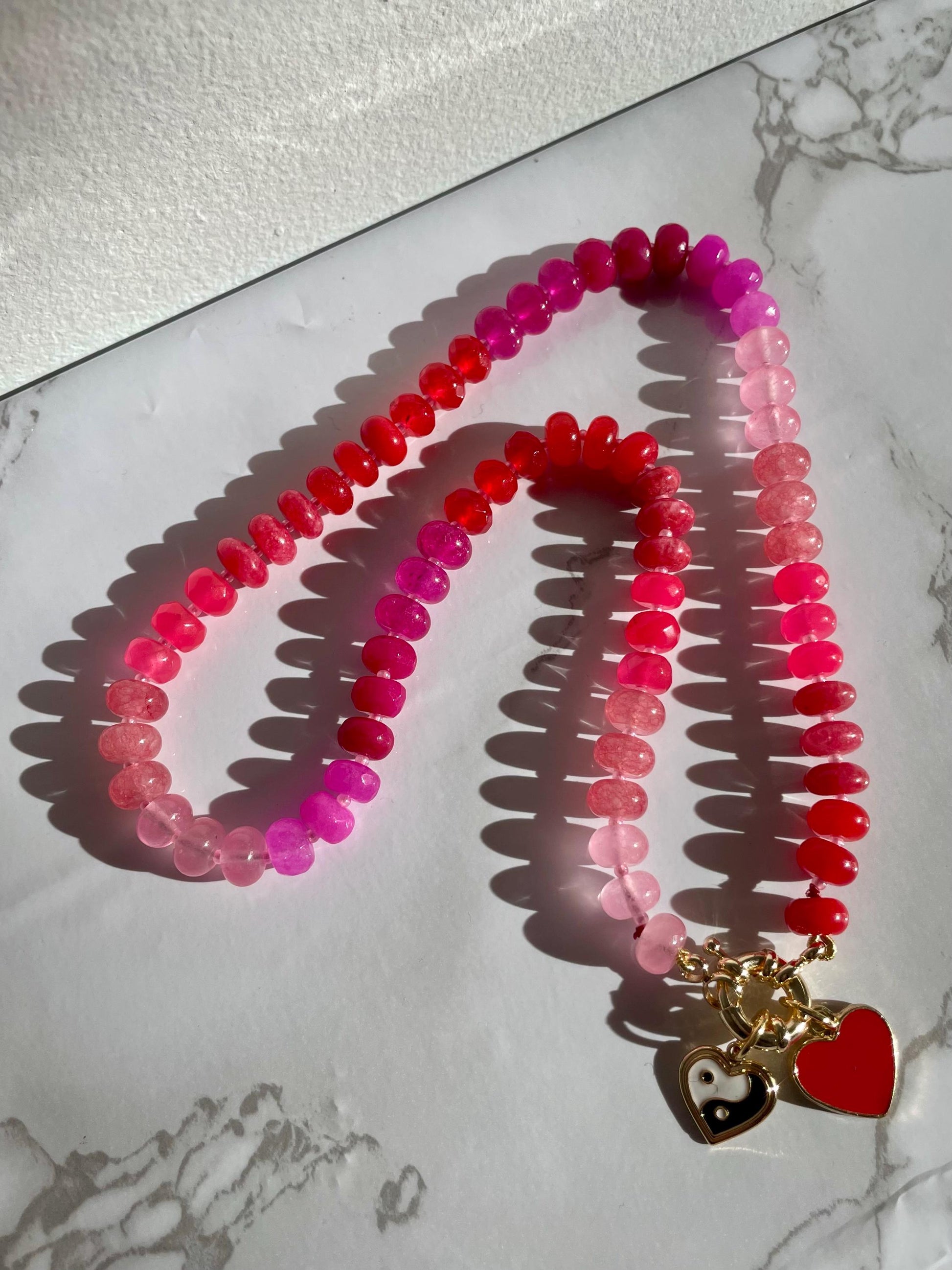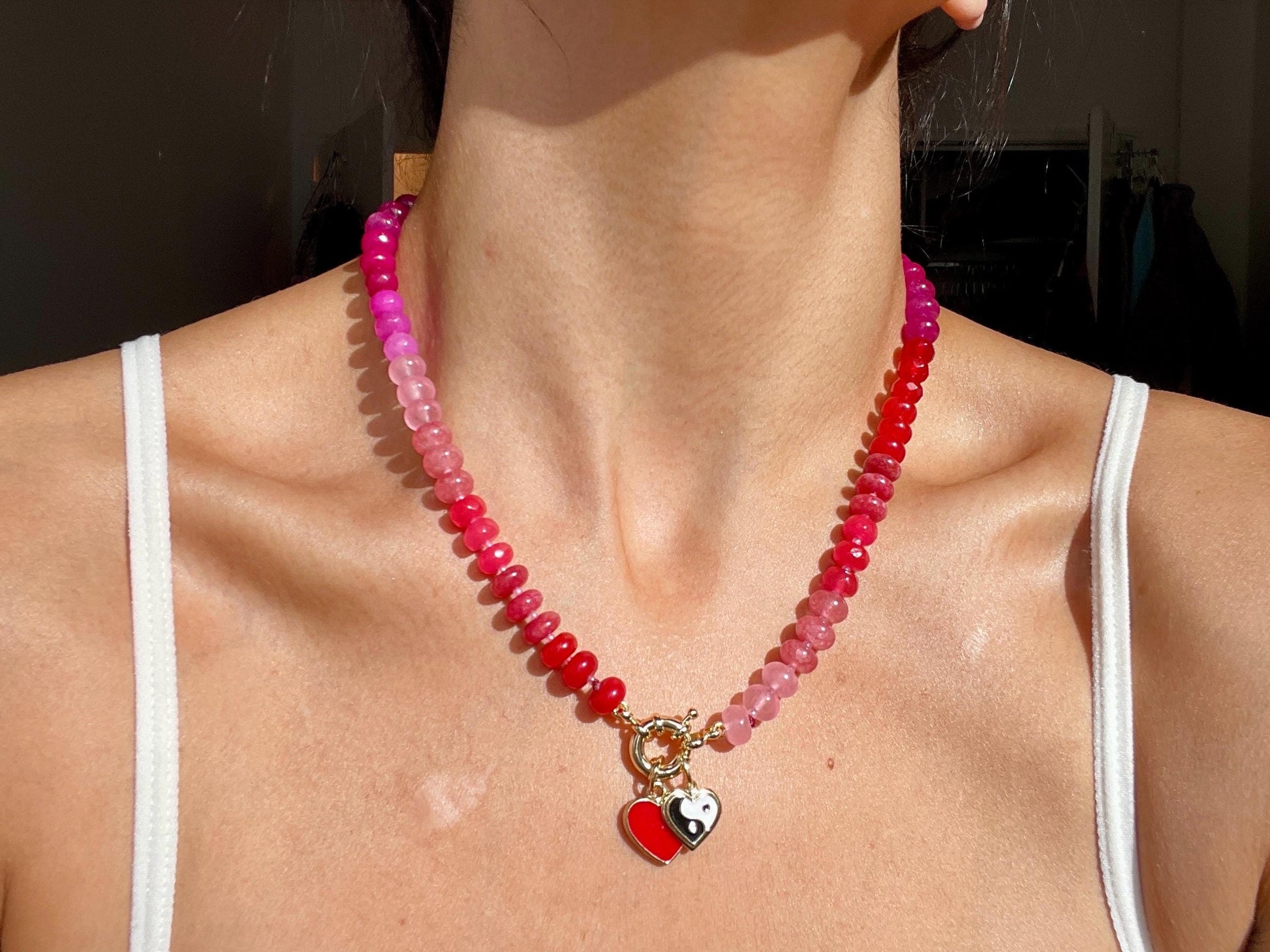 Love Language Gemstone Candy Necklace is a pink & red gemstone colorblock ode to crushes and Valentine’s mailboxes. Finished with 14K gold filled enhancer claps. Listing photos are of the 18" version.