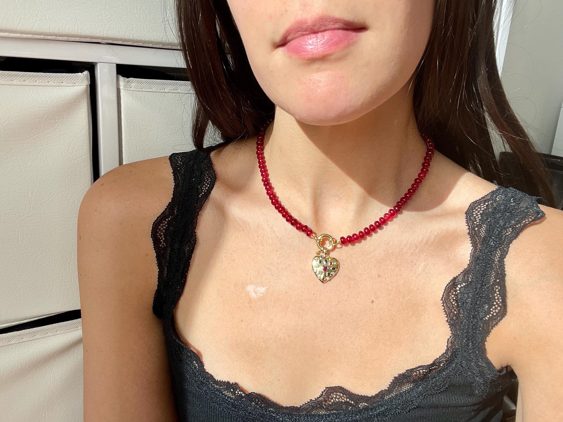 Rich ruby-red stones hand knotted strand with 14K gold filled enhancer clasp and jumbo rainbow gemstone puff heart charm. 16” from clasp to clasp.