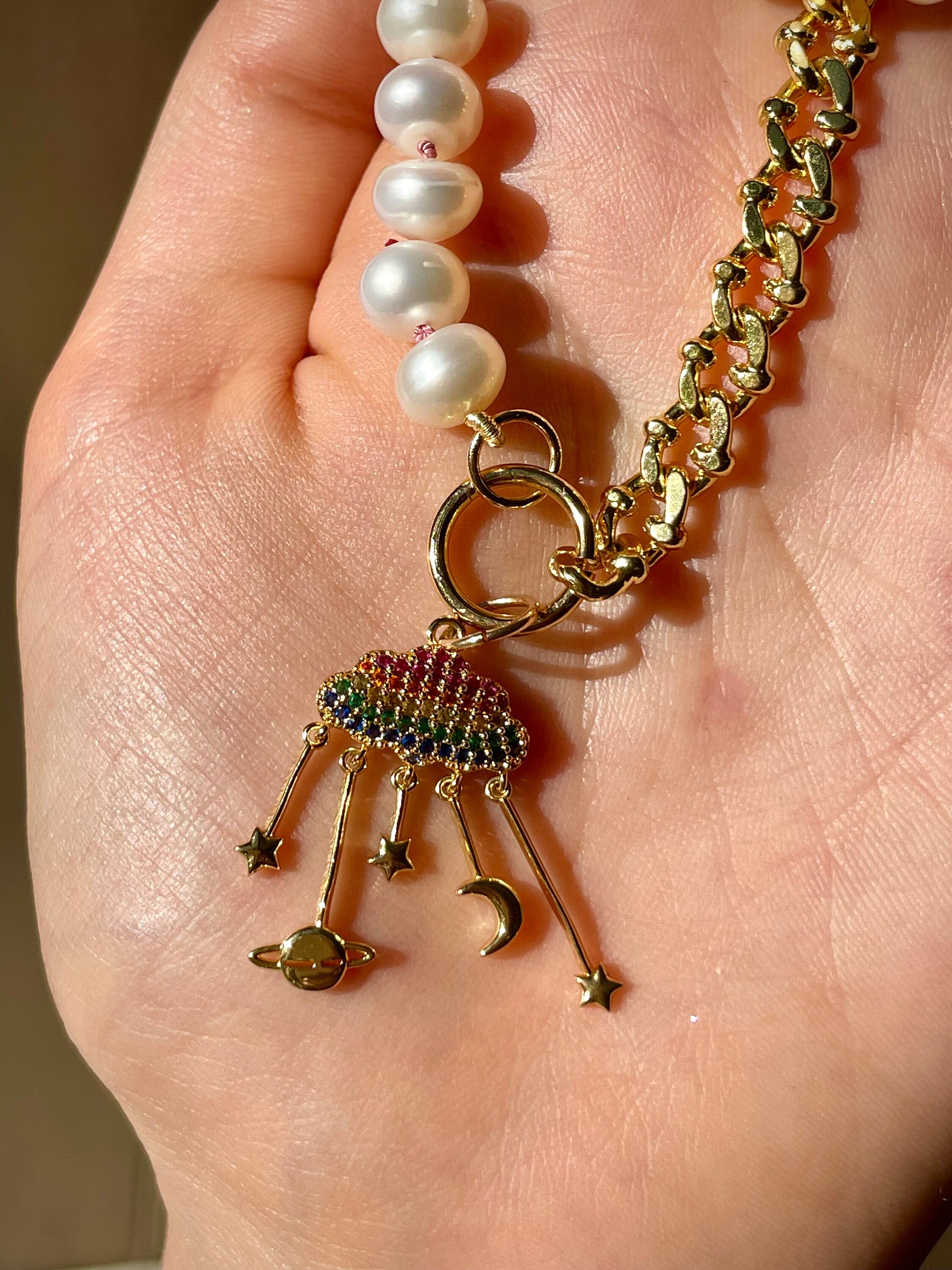 Hand-knotted freshwater pearls and 14k gold filled chain with rainbow galaxy charm, 18” with gold filled findings.