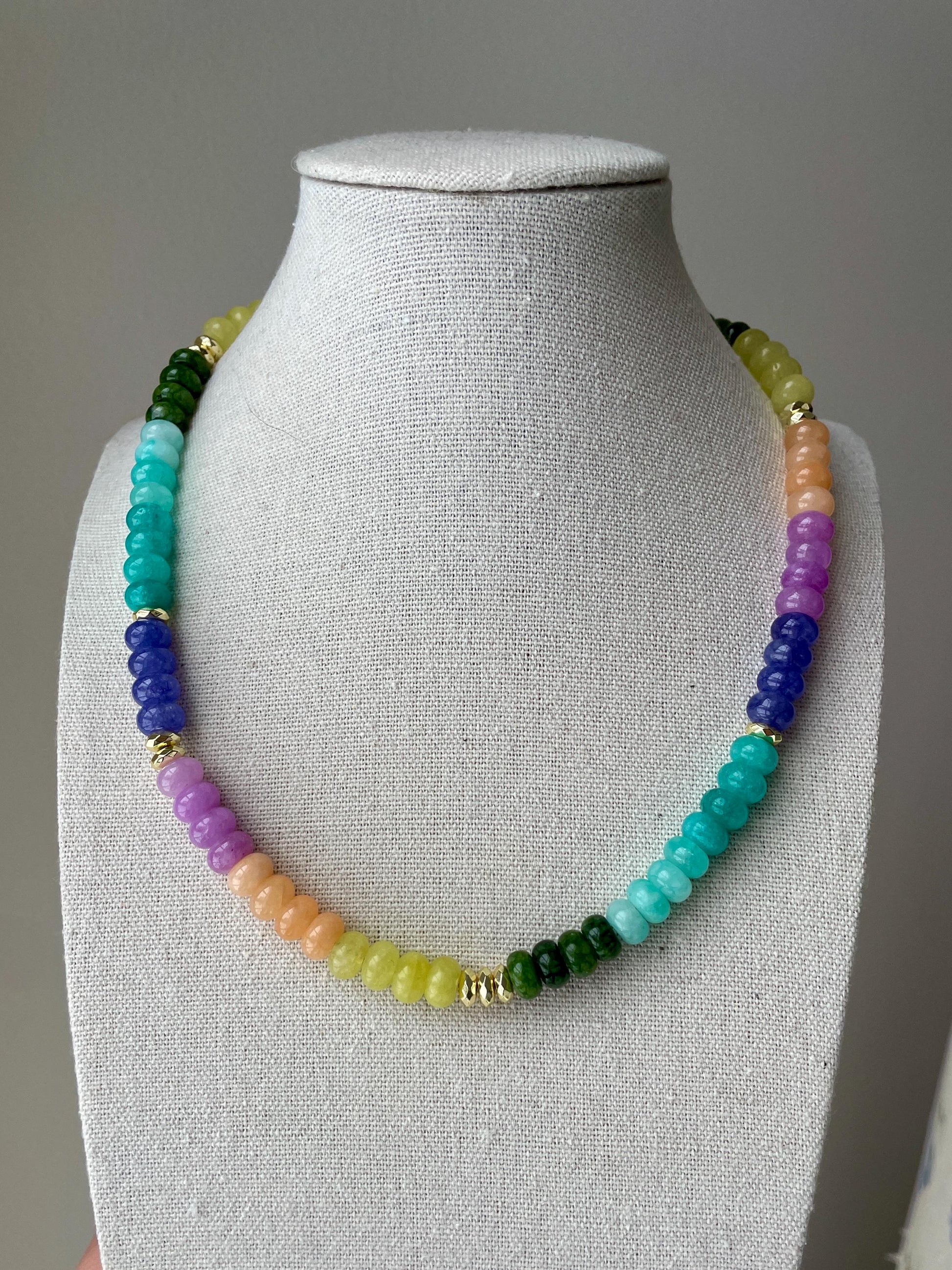 Parade Day is a color blocked gemstone beaded necklace strung on beading wire and finished with 14K gold filled clasp. 17” with 2” extender.