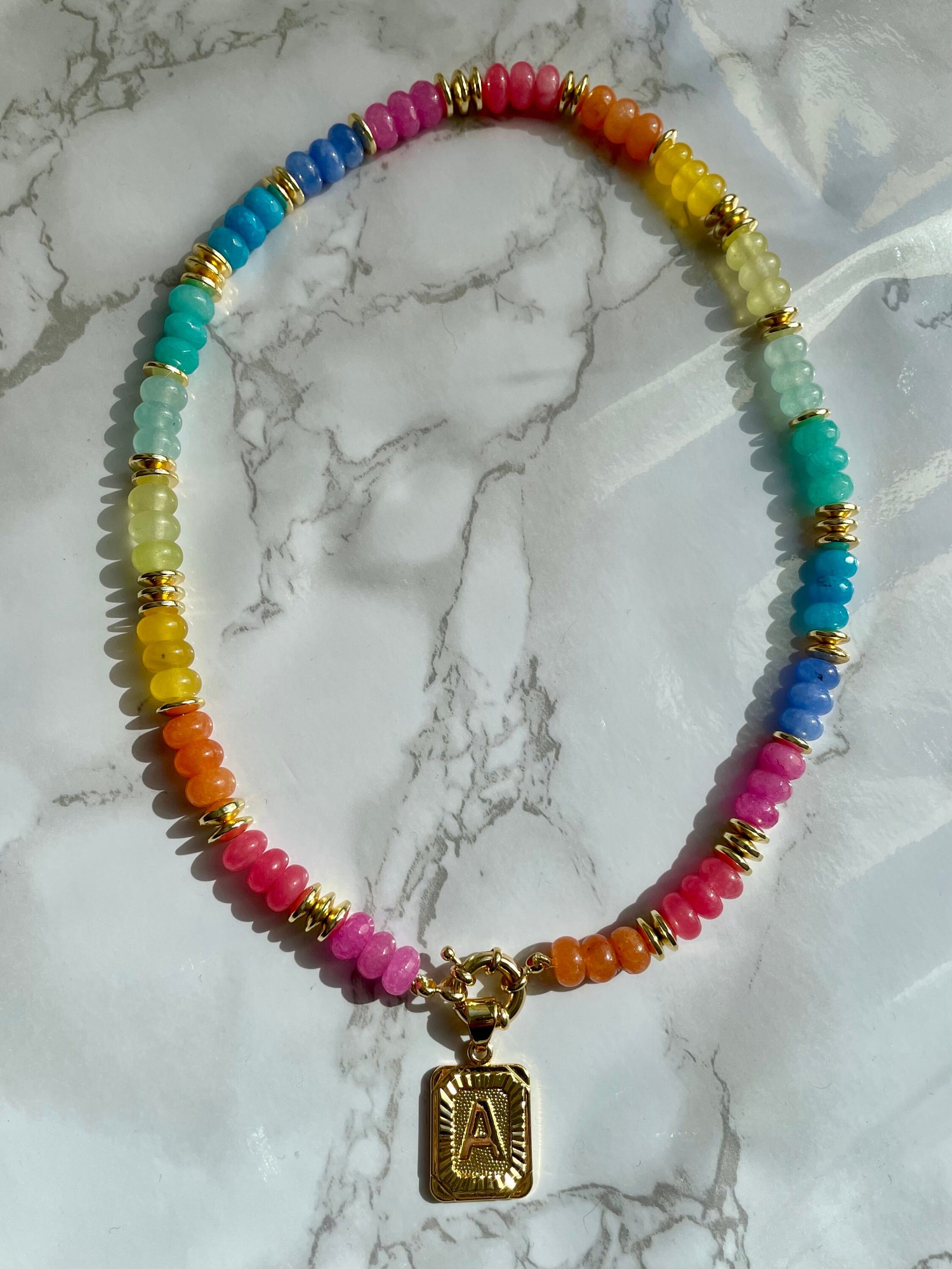 Rainbow gemstone necklace with 14K gold filled saucer accents, finished with large enhancer clasp and initial plate charm.