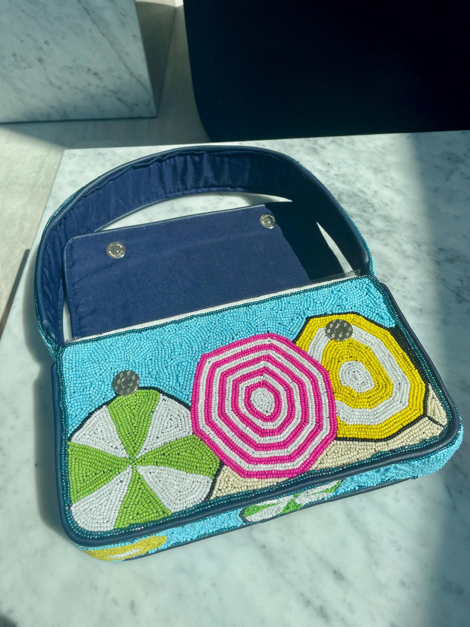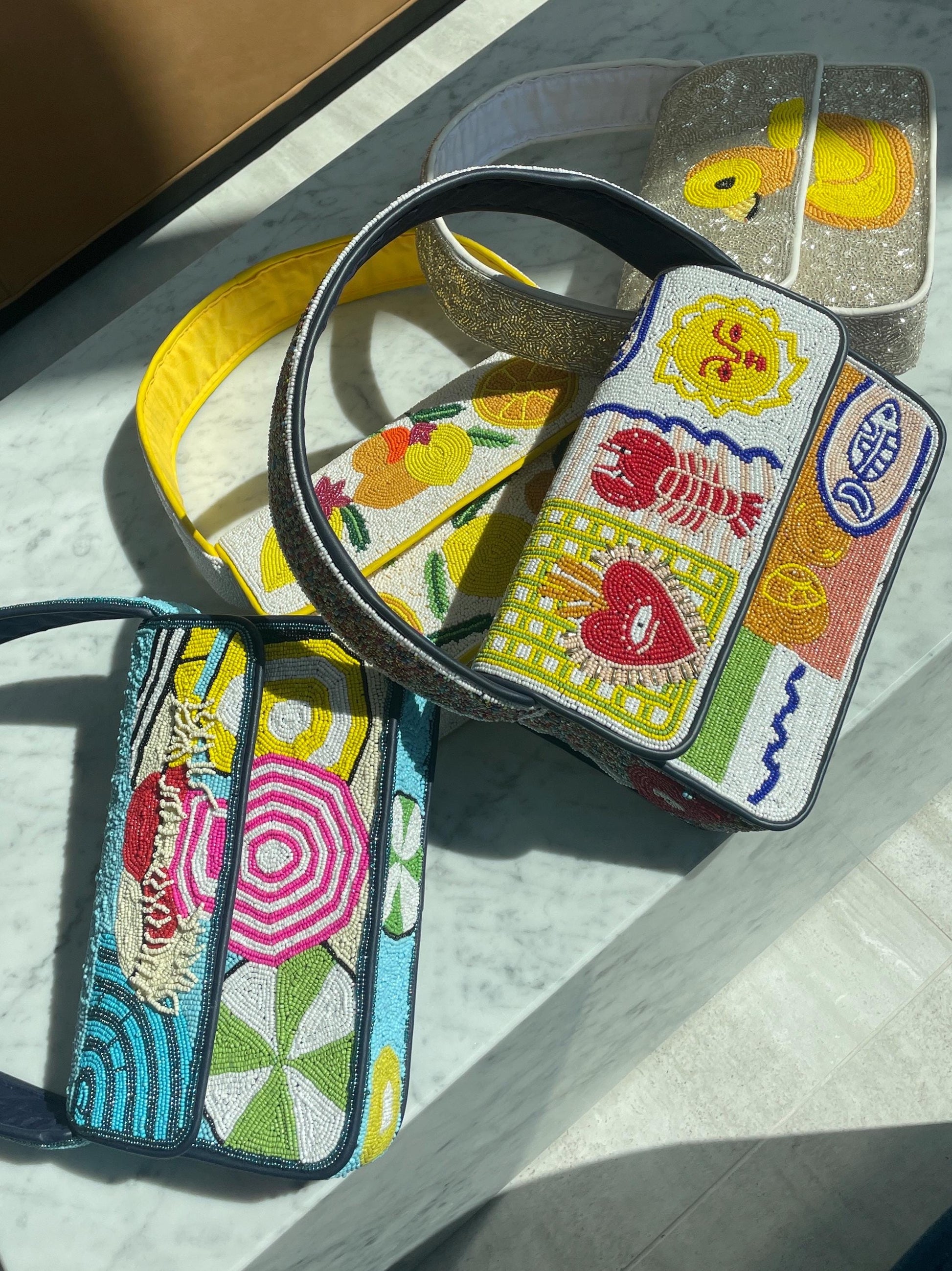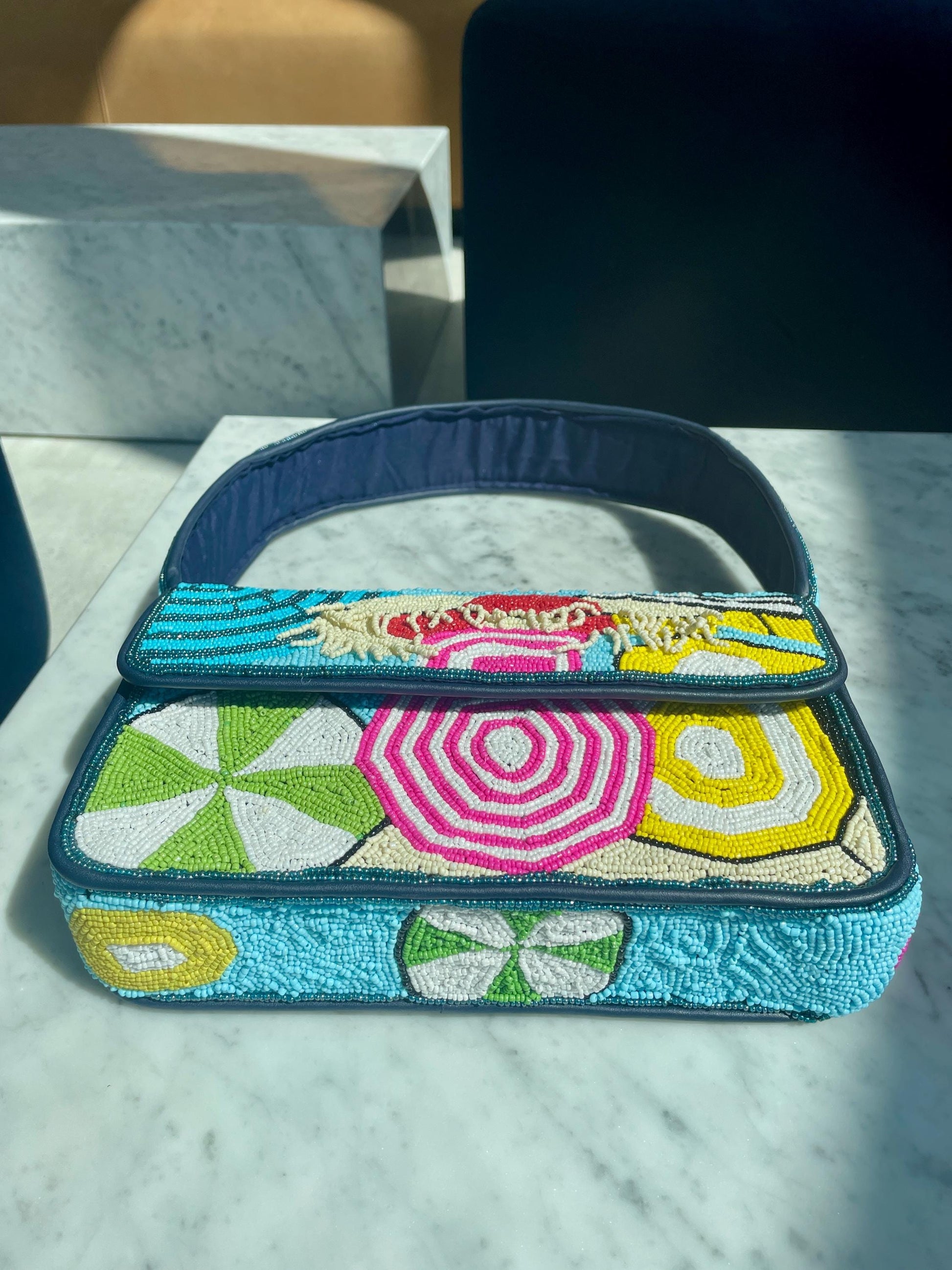 Introducing our new handmade beaded collaboration - the beaded shoulder bags we’ve been dreaming of for spring and summer! Structured shoulder bag with fringed umbrellas on the beach.
