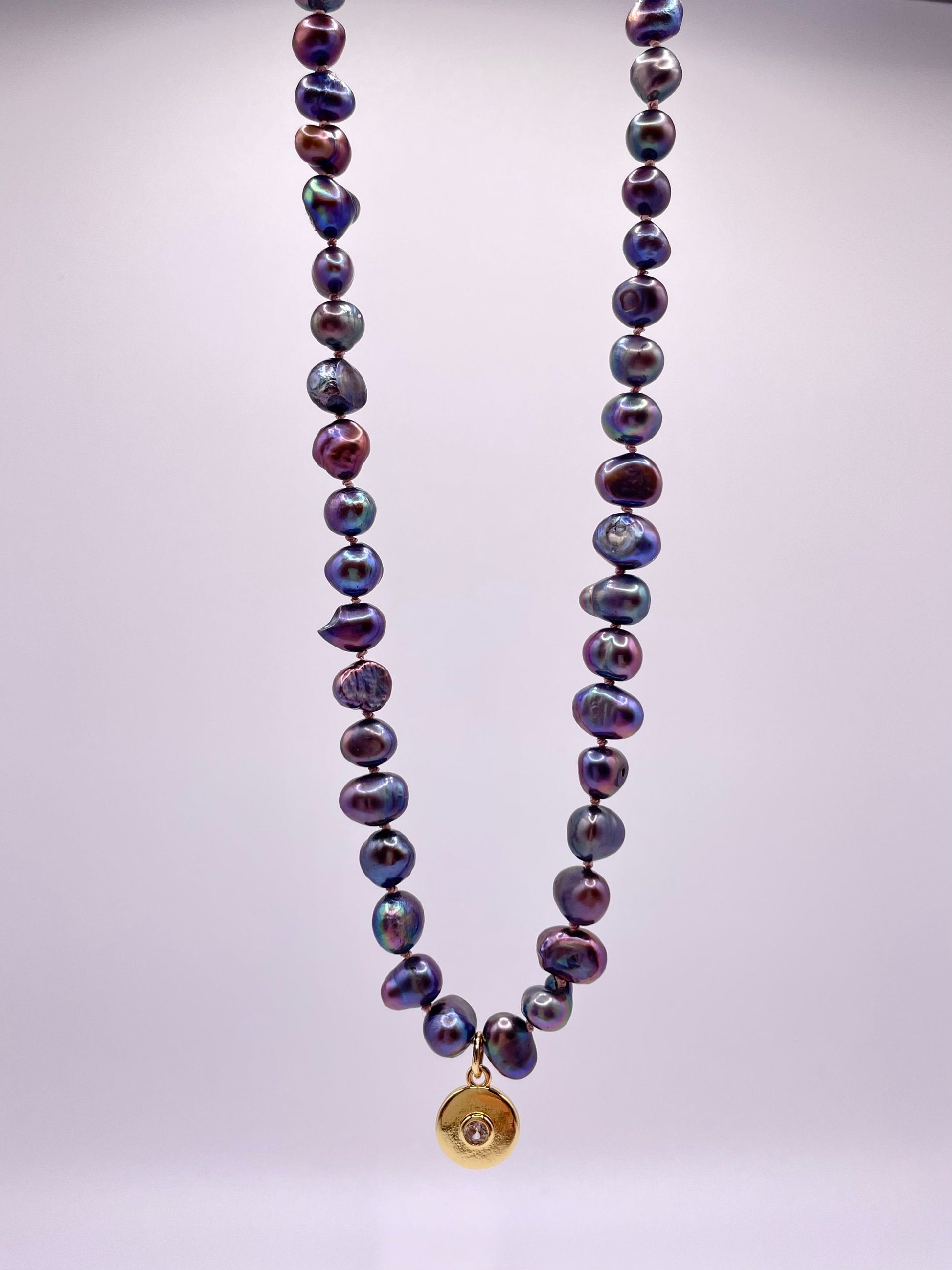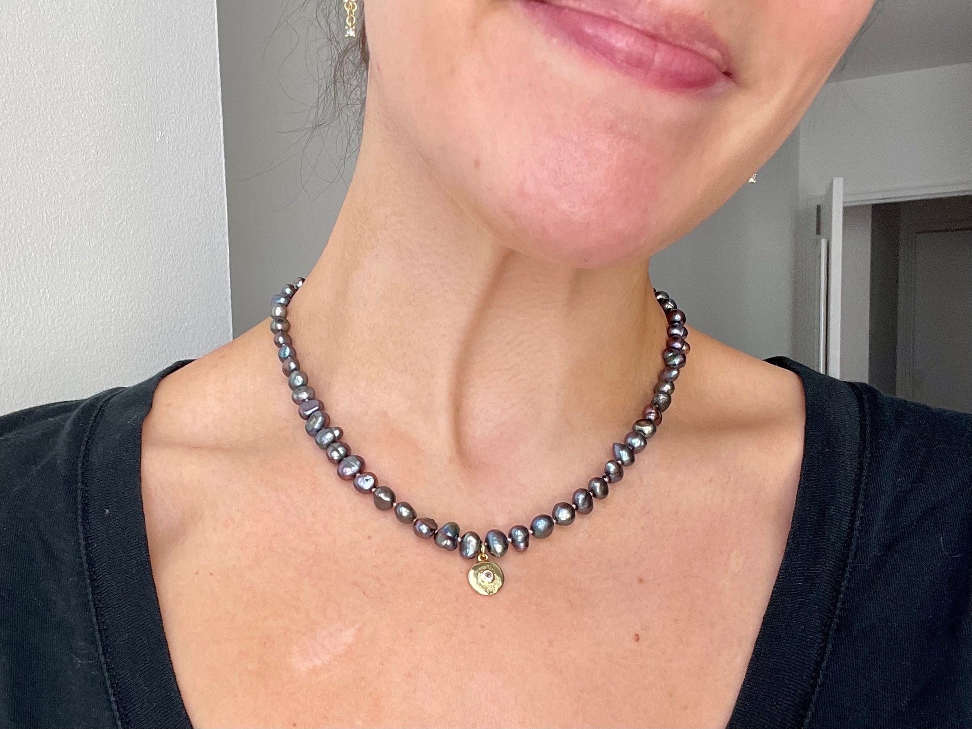 Black freshwater pearls hand knotted on silk thread with 14k gold filled disk charm.