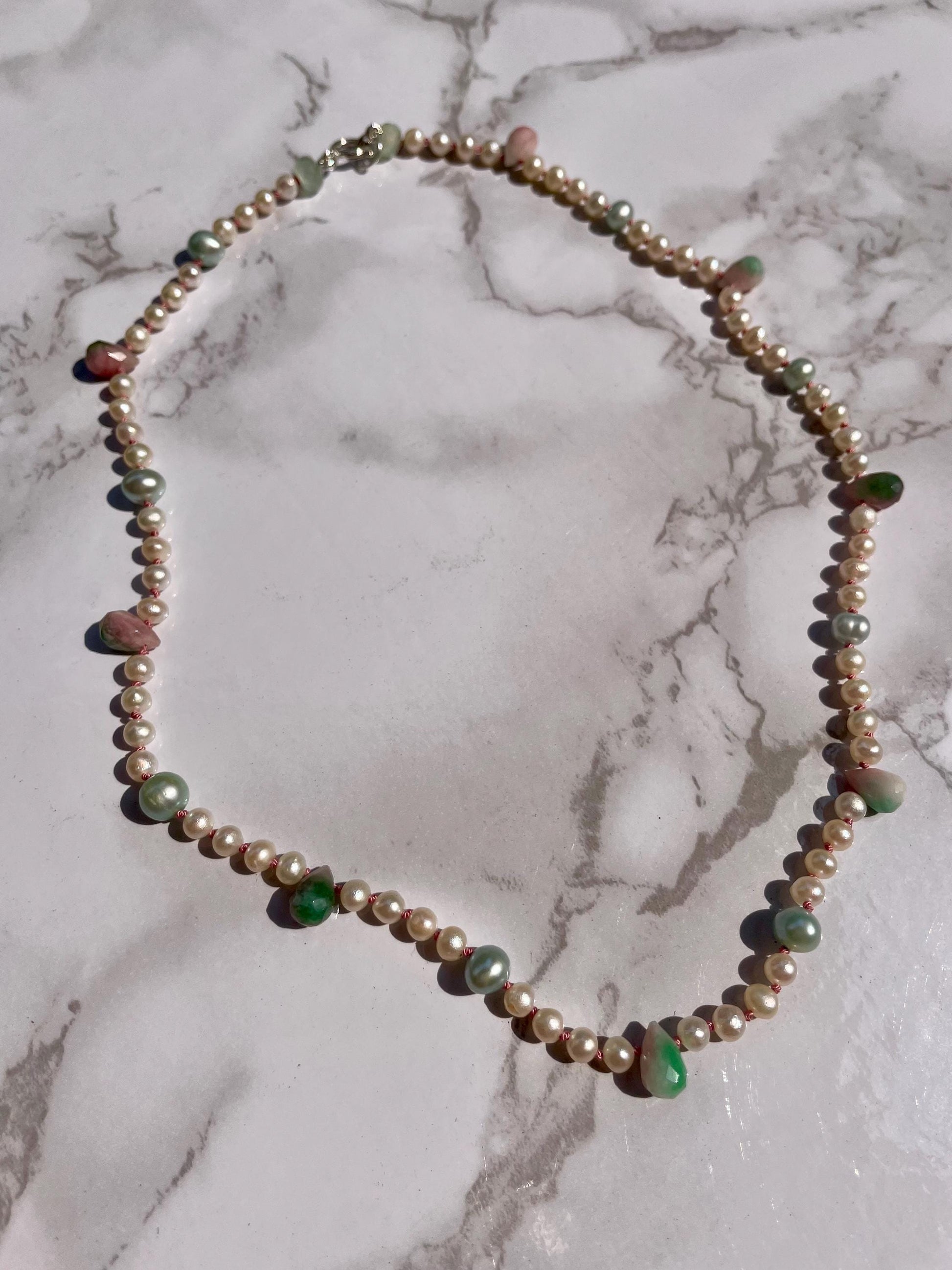 White and baby blue freshwater pearls hand knotted on pink silk thread with watermelon tourmaline teardrops and finished with 925 stamped sterling silver findings.