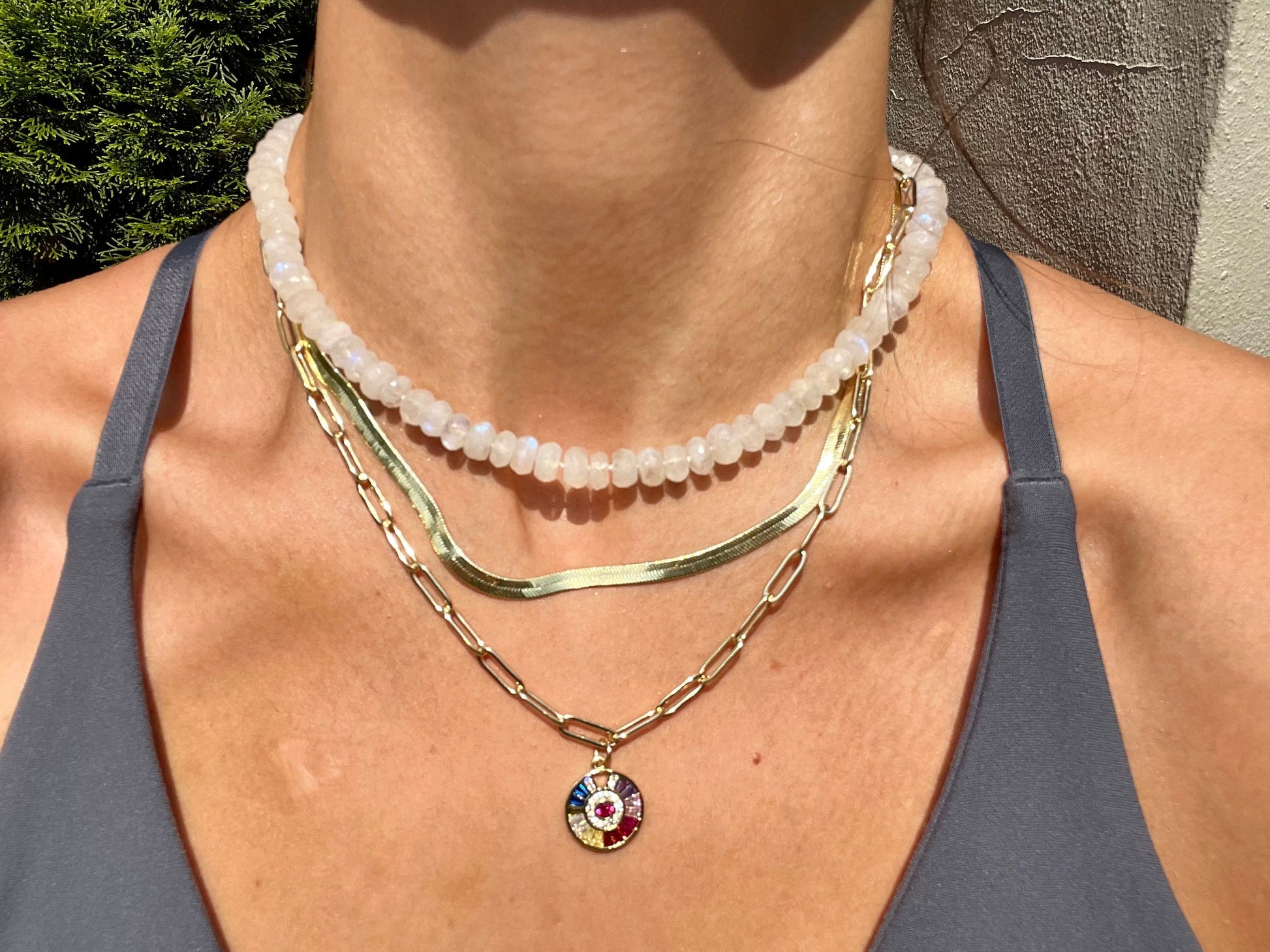 A brilliant rainbow gemstone wheel pendant on 18” 24K gold filled paperclip chain.